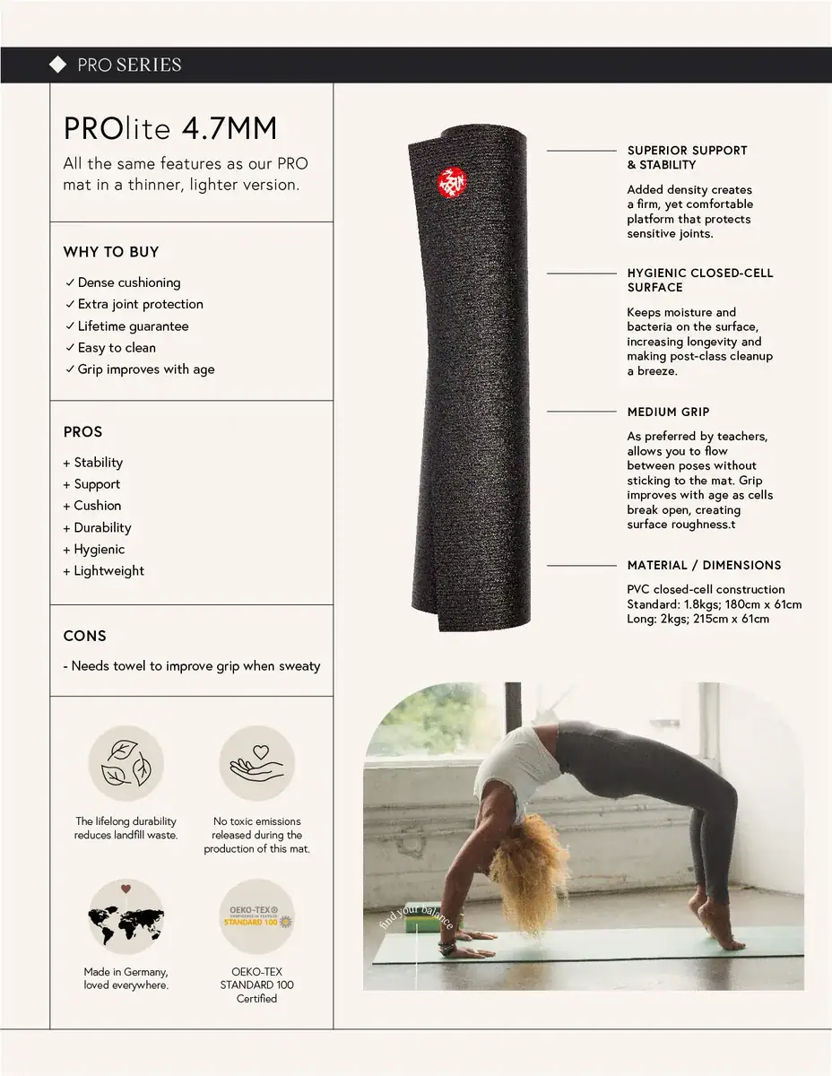 Mandukan PROlite®-joogamatto on täydellinen valinta niille, jotka etsivät joogamattoa, jossa yhdistyvät huippulaatu ja mukavuus. Ihanteellinen suorituskykyinen joogamatto sekä studiolle, kotiin että matkoille.